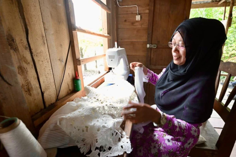Samitri, istri Ruslan, penerima manfaat Program Bantuan Pasang Baru Listrik (BPBL) tampak semangat menjahit baju pesanan pelanggan di rumahnya di Desa Bandar Jaya, Musi Banyuasin, Sumatera Selatan. Pascatersambung listrik PLN, ia dan suaminya kini dapat menambah pemasukan untuk keluarga, dimana sebelumnya hanya mengandalkan penghasilan Ruslan sebagai buruh tani.