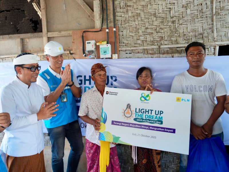 Senyum bahagia terpancar dari I Nyoman Nuki (tengah) dan Made Rasmi (kedua dari kanan), pasangan suami istri penerima manfaat bantuan penyambungan listrik gratis PLN. Penyerahan simbolis dilakukan oleh GM PLN UID Bali Eric Rossi Priyo Nugroho (kedua kiri) dan Wakil Walikota Denpasar, I Kadek Agus Arya Wibawa (kiri) di Denpasar, Senin (27/10/2025).