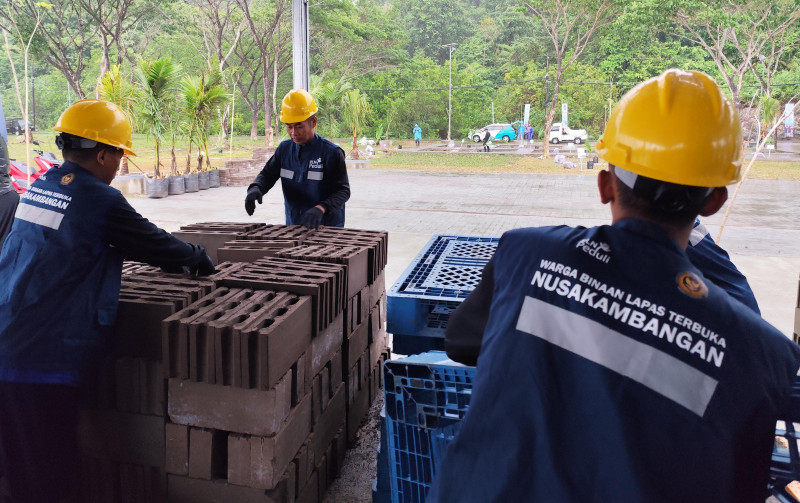 Warga Binaan Lapas Nusakambangan menjemur tumpukan batako yang baru saja selesai dicetak di Workshop FABA PLN. Melalui program pemberdayaan komunitas, FABA dimanfaatkan menjadi sumber daya yang potensial dalam pembangunan infrastruktur dan mendukung konsep sirkular ekonomi kerakyatan.