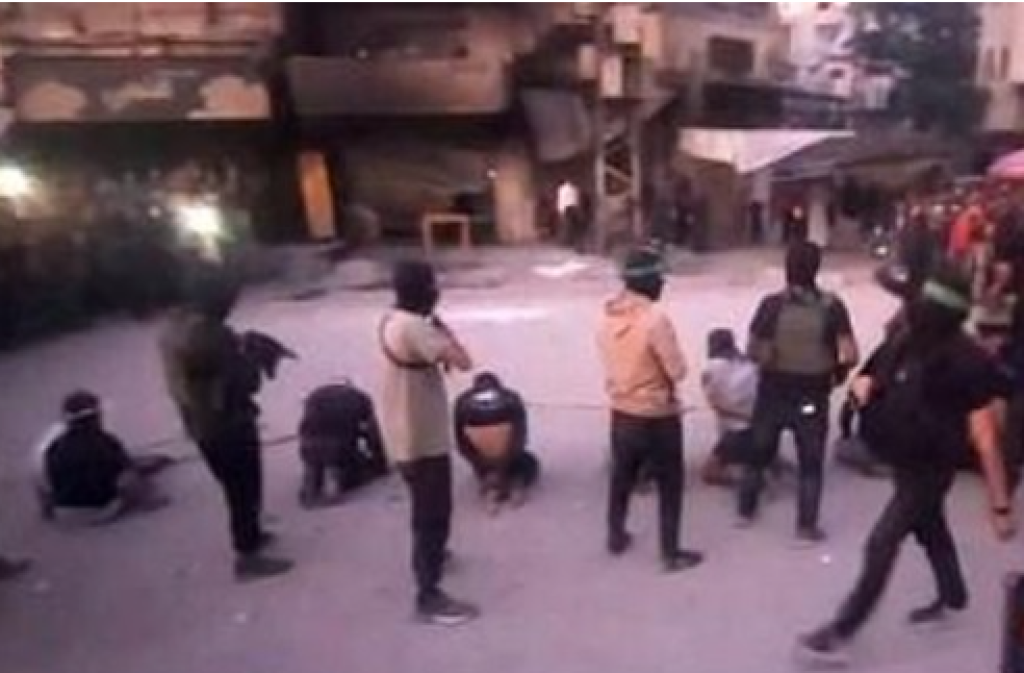 Sebuah video yang dirilis di saluran Telegram al-Aqsa TV pada Senin malam memperlihatkan delapan pria dengan mata tertutup, tangan terikat, dan dipaksa berlutut sebelum ditembak dari jarak dekat di jalanan ramai di depan kerumunan warga yang menyaksikan tanpa bisa berbuat apa-apa.