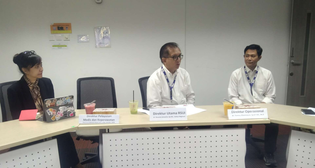 Direktur Utama RSUI, Dokter Kusuma "Ari" Januarto, Sp.OG, Subsp. Obginsos (tengah); Direktur Operasional Dokter Tommy Dharmawan, Sp.BTK, PhD (kanan), saat temu wartawan yang bergabung di PWI Kota Depok, Jumat (24/10/2025). WAHANANEWS.CO / Hendrik Raseukiy]
