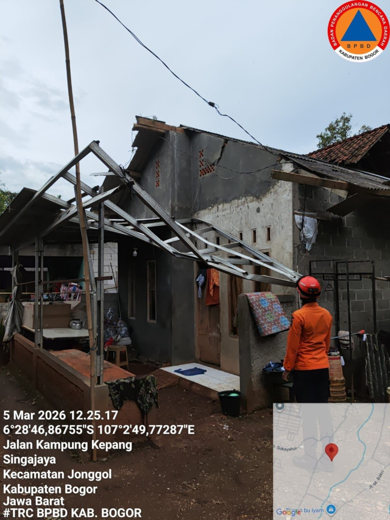 Atap rumah warga rusak akibat tersapu angin kencang di Kabupaten Bogor pada Rabu (4/3/2026). [Sumber Foto: BPBD Kab. Bogor]
