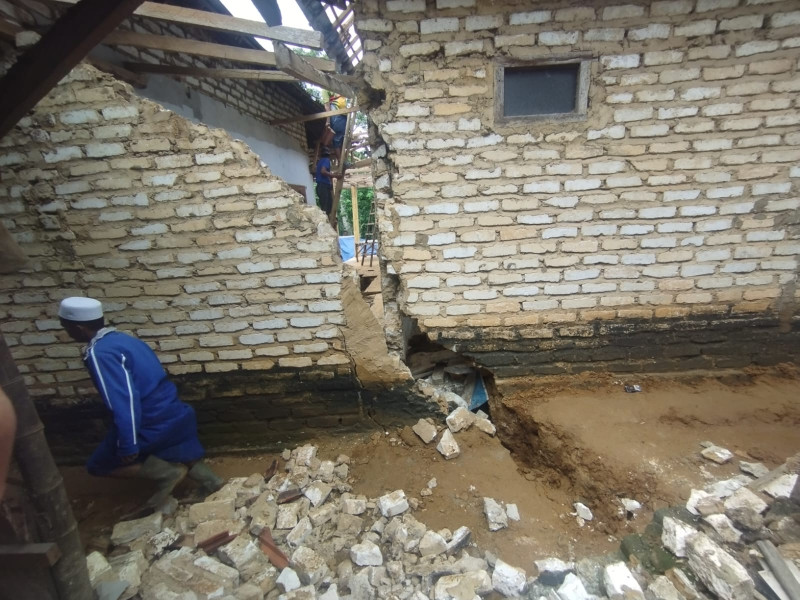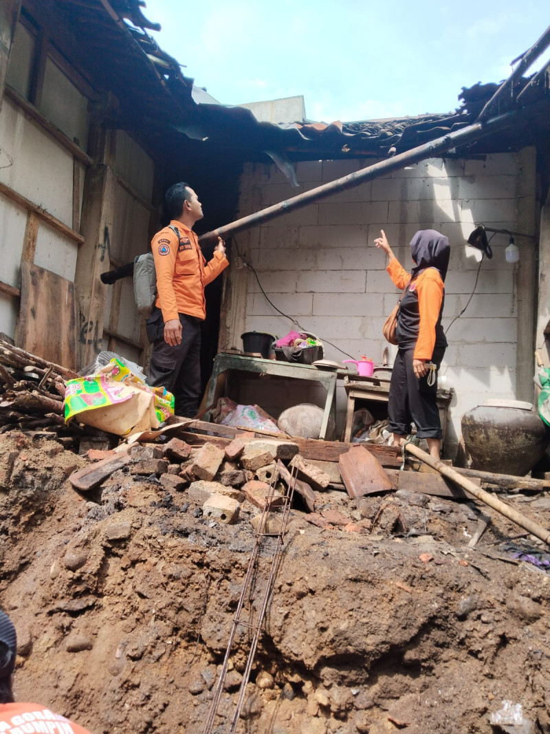 Personil BPBD Kabupaten Bogor melakukan asesmen terhadap rumah warga Desa Gobang, Kecamatan Rumpin, Kabupaten Bogor, yang terdampak longsor pada Sabtu (17/1/2026). [Sumber: BPBD Kabupaten Bogor].