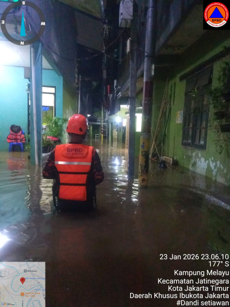 Salah satu titik banjir terparah di wilayah Kampung Melayu, Kecamatan Jatinegara, Jakarta Timur, Sabtu (24/1/2026). [Foto: BPBD DKI Jakarta].