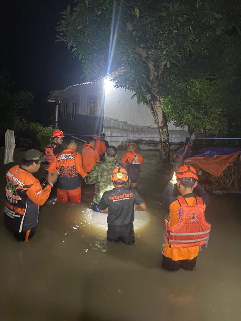 Tim BPBD Kabupaten Jember melakukan penanganan dan asssement saat banjir melanda Desa Ampel, Kecamatan Wuluhan, Kabupaten Jember, pada Selasa (13/1/2026). [Sumber foto: BPBD Kab. Jember].