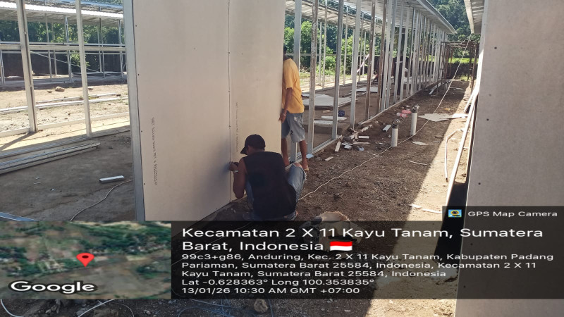 Pekerjaan pembangunan Hunian Sementara Tahap I berlangsung di Nagari Anduring, Kecamatan Asam Pulau, Kabupaten Padang Pariaman, Sumatera Barat, Selasa (13/1/2026).