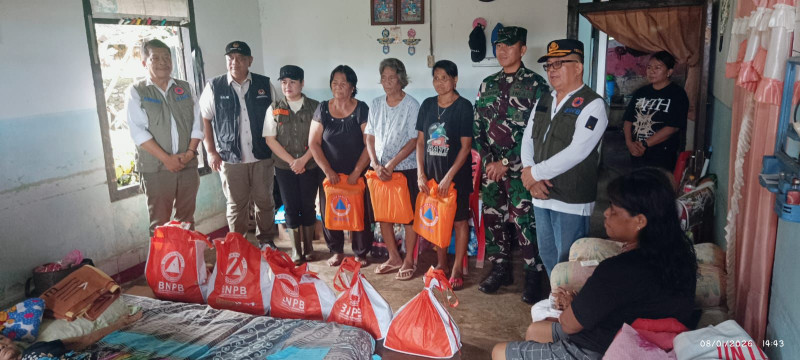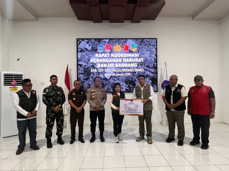 Rombongan pemerintah pusat yang dipimpin oleh Plt. Deputi Bidang Pencegahan BNPB, Drs. Pangarso Suryotomo, M.MB, bersama Deputi Bidang Koordinasi Penanggulangan Bencana dan Konflik Sosial Kemenko PMK, Dr. Lilik Kurniawan, menyerahkan bantuan logistik darurat kepada Pemerintah Kabupaten Kepulauan Sitaro.