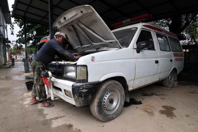 Montir relawan melakukan perbaikan mesin mobil ambulance yang sempat terendam banjir di RSUD Muda Sedia, Aceh Tamiang, Kamis (8/1/2026).