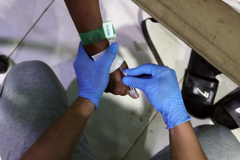 Tenaga kesehatan mengambil sampel darah pasien rawat jalan untuk observasi kesehatan di RSUD Muda Sedia, Aceh Tamiang, Kamis (8/1/2026).