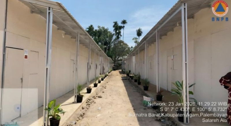 Kondisi progres pembangungan hunian sementara bagi warga terdampak bencana hidrometeorologi di Provinsi Sumatra Barat pada Jumat (23/1/2026).