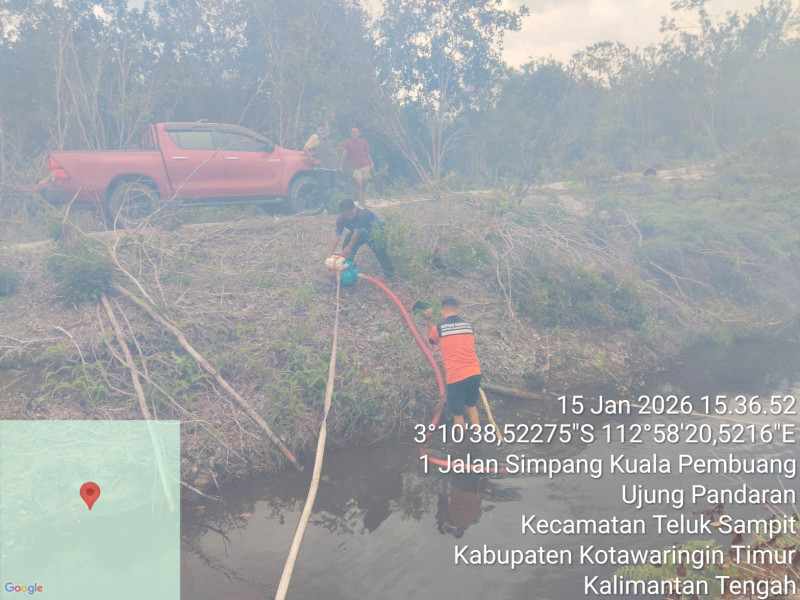 BPBD Kabupaten Kotawaringin Timur bersama tim gabungan melakukan pemadaman dan pendinginan pada lahan yang terbakar di K pada Kamis (15/1/2026). [Sumber foto: BPBD Kabupaten Kotawaringin Timur].