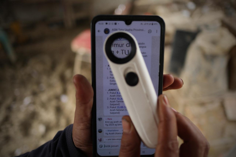 Tenaga tata usaha sekolah, Muslim Hasan, memeriksa pesan grup jejaring komunikasi melalui ponsel pintar menggunakan alat bantu saat beraktivitas di Sekolah Luar Biasa (SLB) Negeri Pembina Aceh Tamiang, yang terdampak banjir, Selasa (13/1/2026).