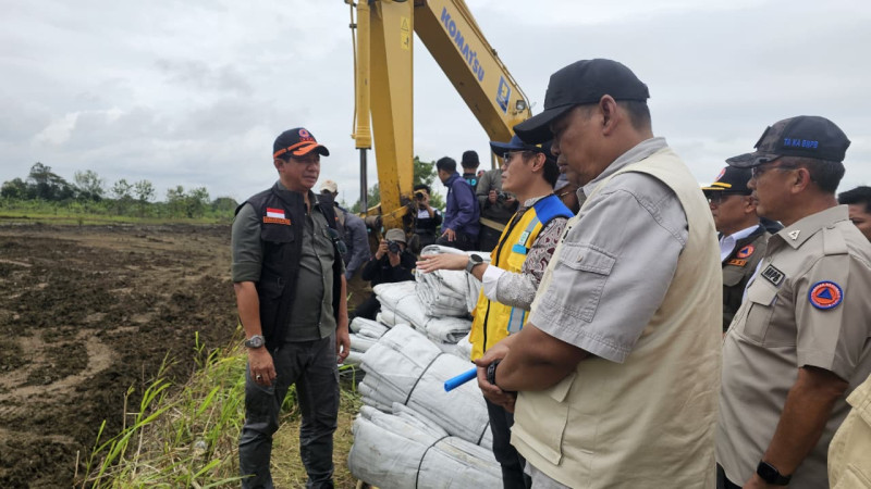 Kepala Badan Nasional Penanggulangan Bencana (BNPB) Letjen TNI Dr. Suharyanto, S. Sos., M.M. (kemeja hijau dan rompi hijau) saat meninjau progres perbaikan tanggul di Desa Tinanding, Kecamatan Kebonagung, Kabupaten Grobogan, Provinsi Jawa Tengah, pada Jumat (20/2/2026).