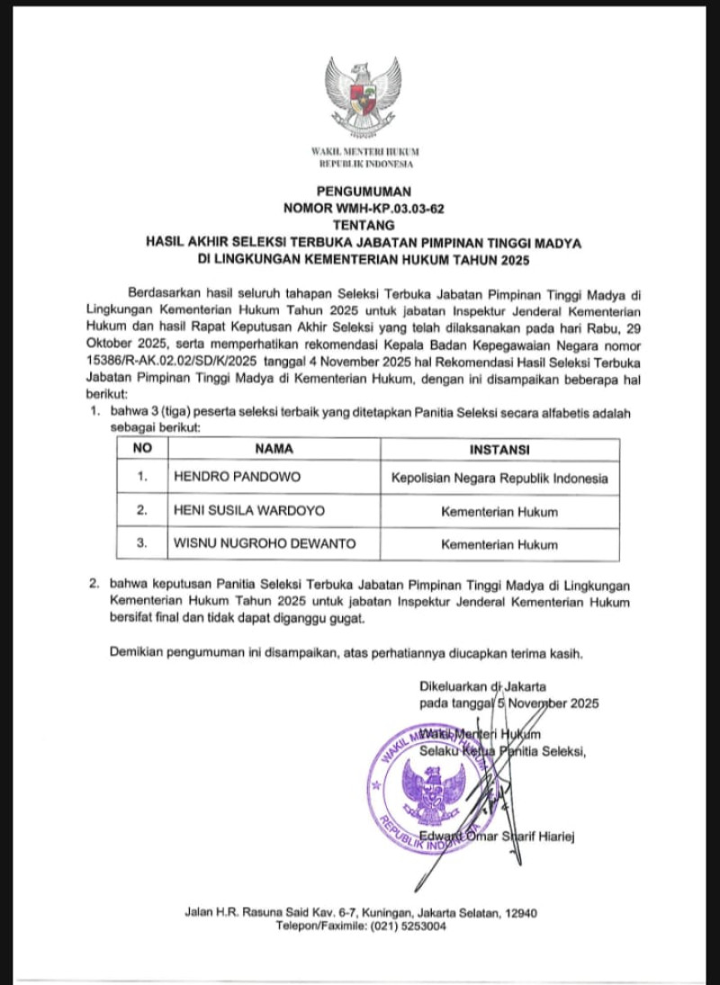 Pengumuman kelulusan hasil seleksi terbuka pimpinan jabatan Eselon I (Irjen) di Kemenkum. [WahanaNews.co/Istimewa]